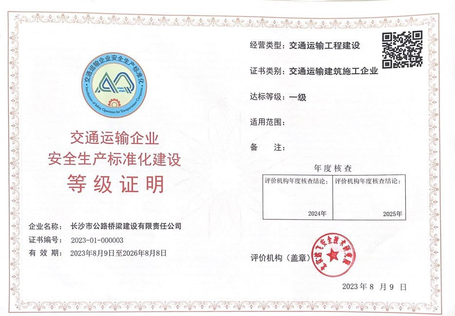 公司順利獲得交通運(yùn)輸施工企業(yè) 一級(jí)安全生產(chǎn)標(biāo)準(zhǔn)化新證書(shū)
